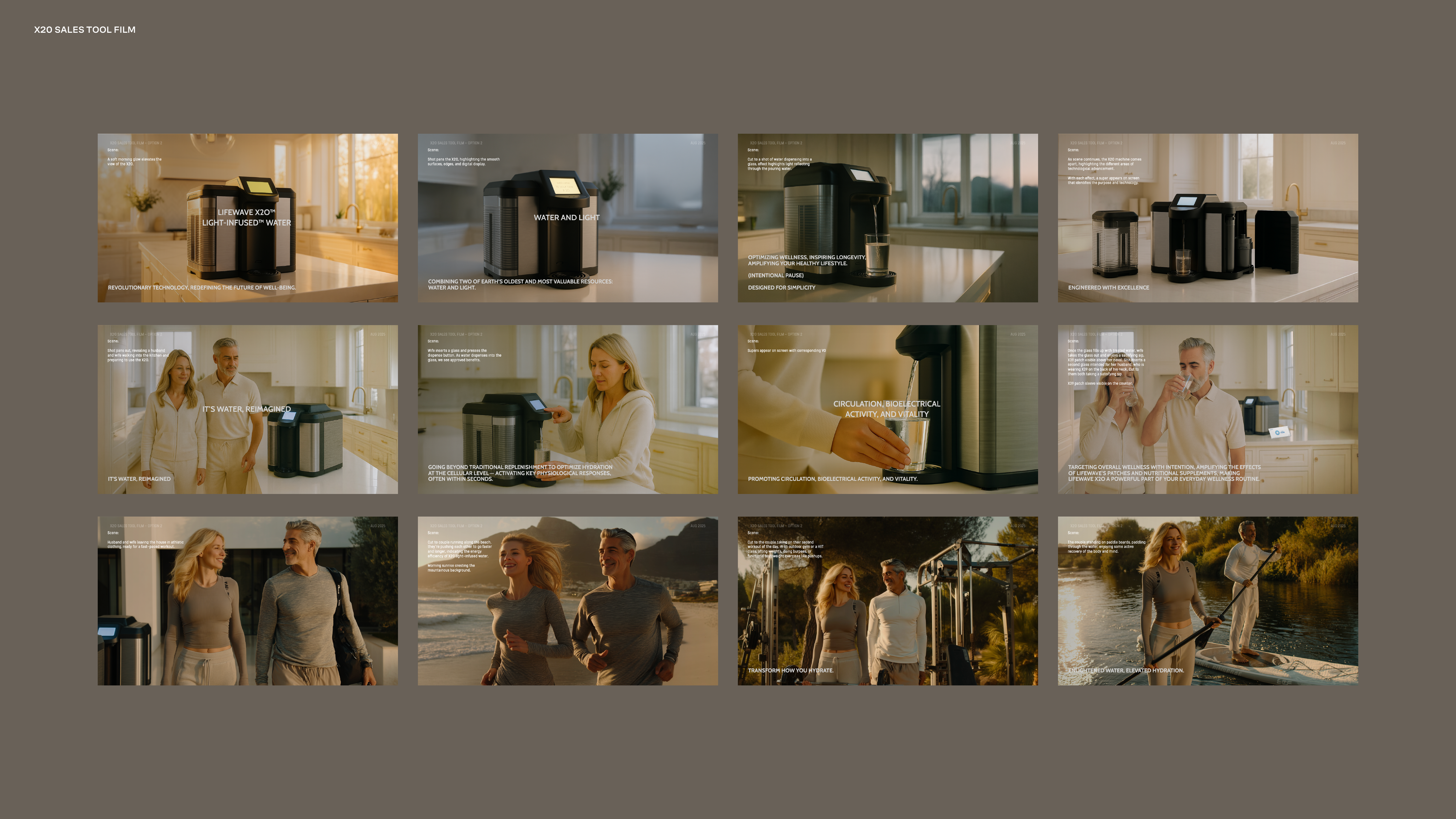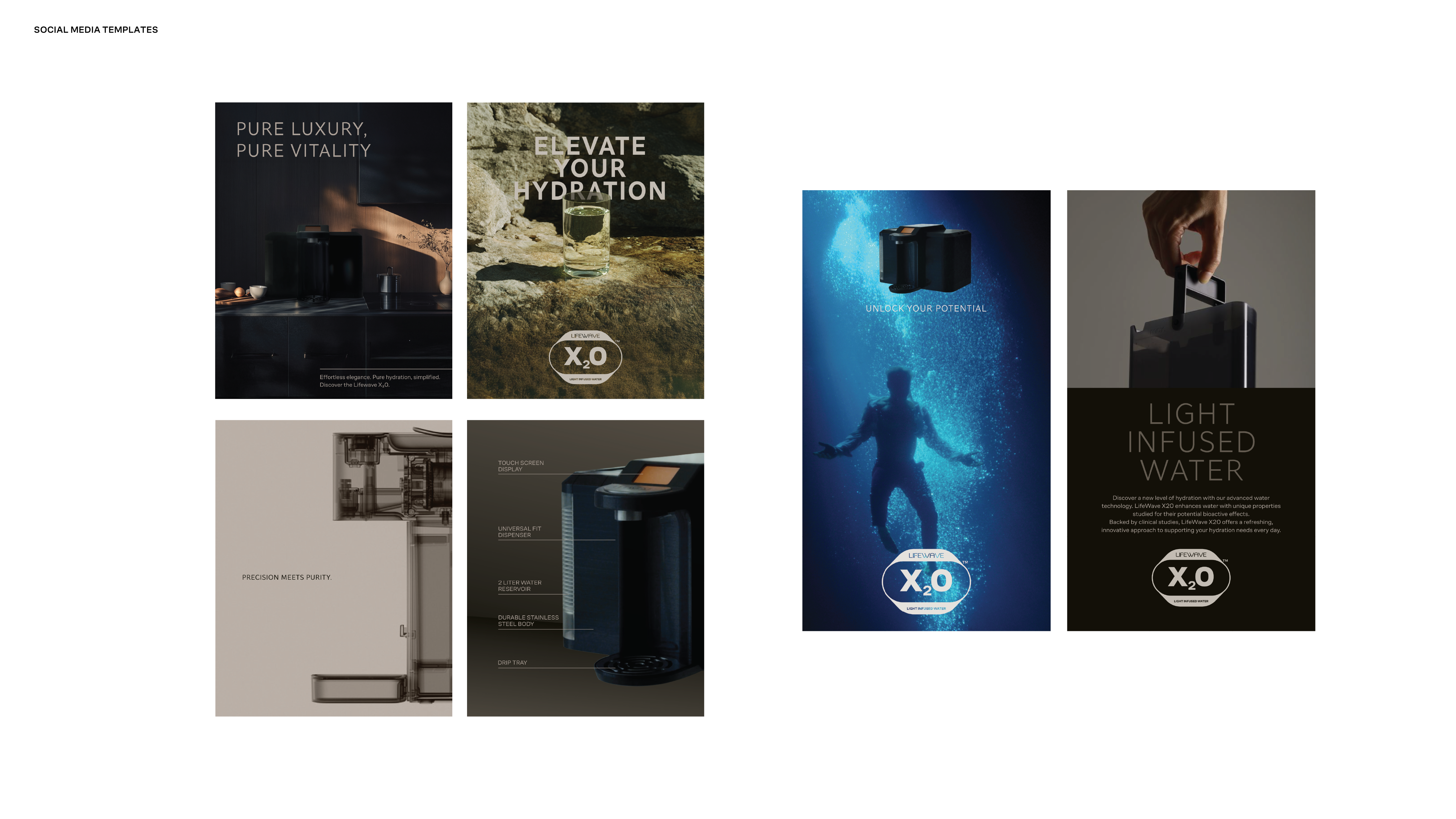 The imagery system positions X20 at the intersection of precision engineering and elevated wellness. It moves between minimal hero product shots, engineered detail, refined lifestyle integration, and abstract expressions of light and water.