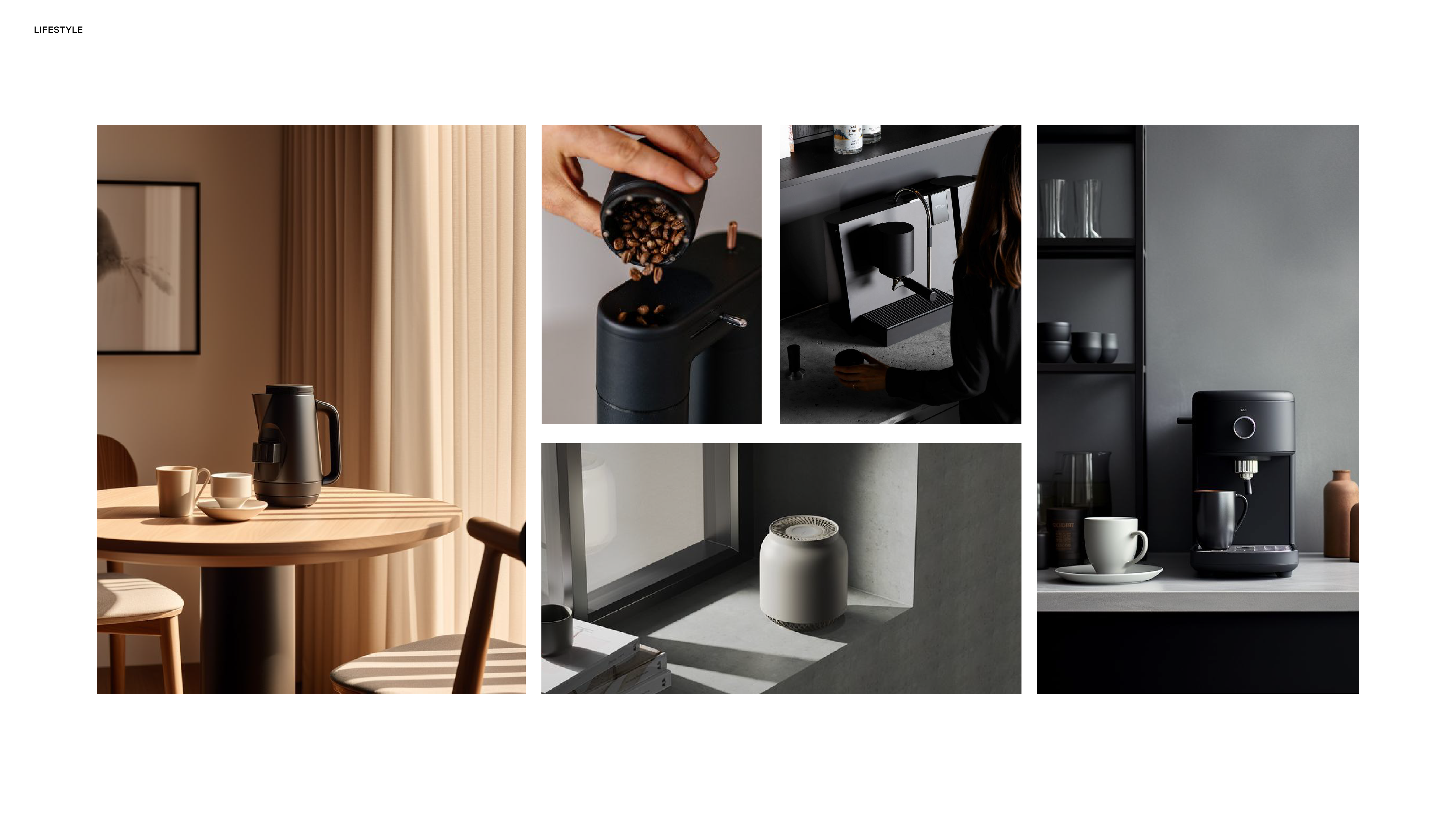 Hero imagery is clean and controlled, using warm neutrals and sculpted lighting to emphasize material quality and form. Technical close-ups and transparency-inspired visuals communicate innovation and trust. Lifestyle scenes place the machine within modern, minimal interiors, showing it as part of a daily ritual rather than a standalone object.