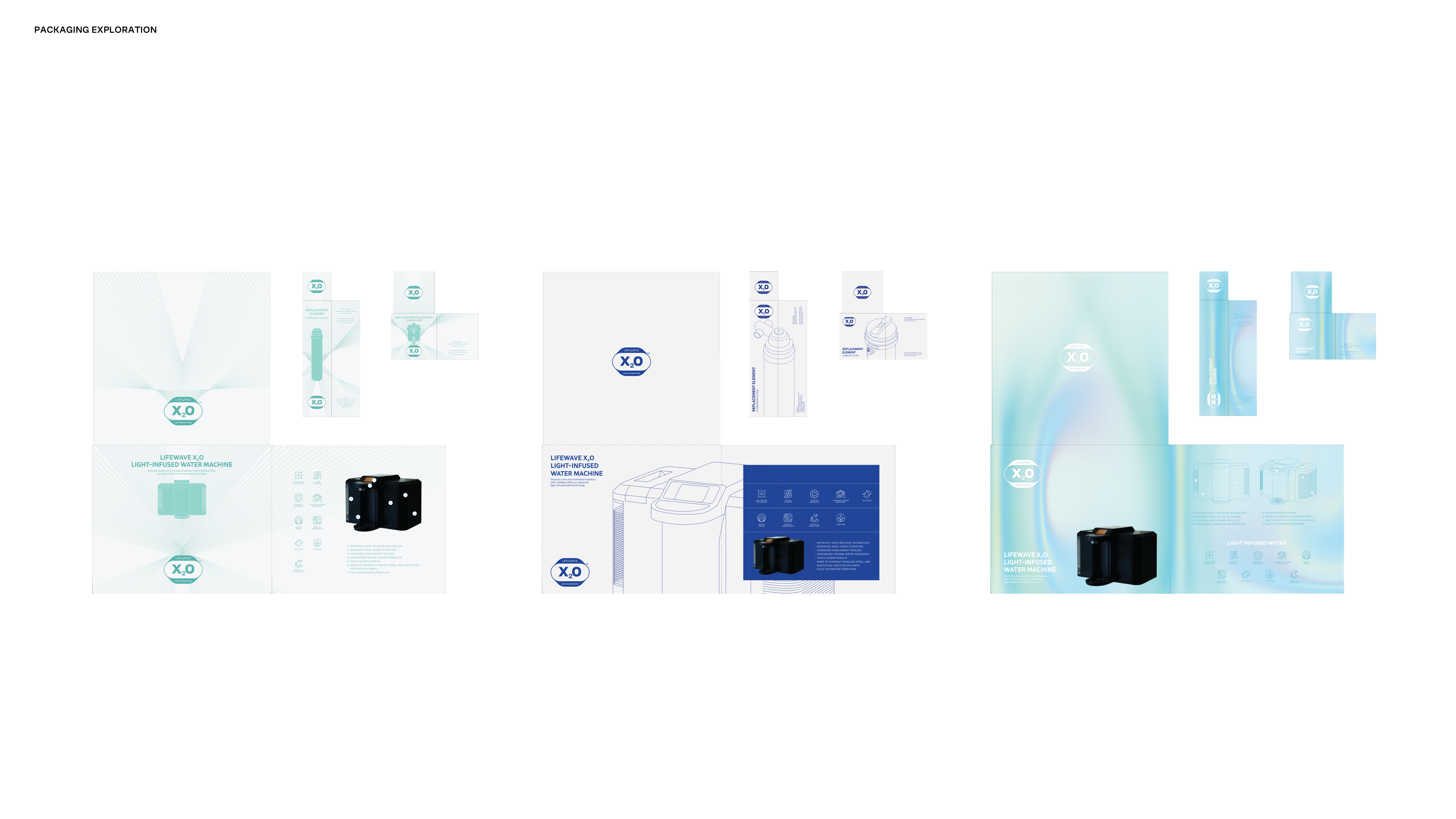 The packaging explores how light, water, and technology can be expressed through a refined, structured system. From minimal radiance lines to atmospheric gradients and water textures, each direction balances innovation with clarity while maintaining strong hierarchy and alignment with the broader LifeWave visual language.