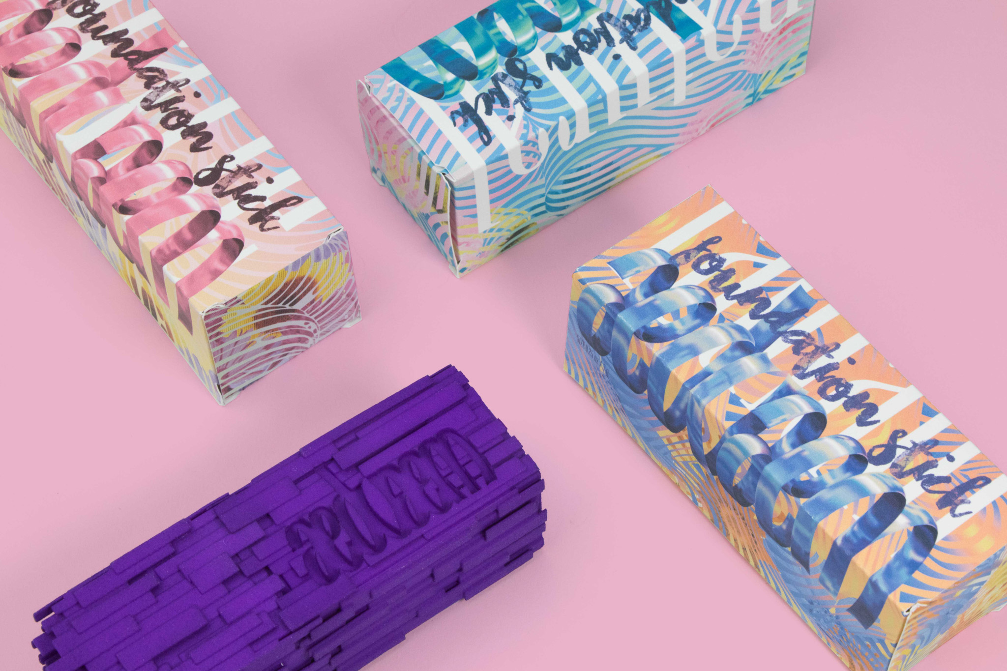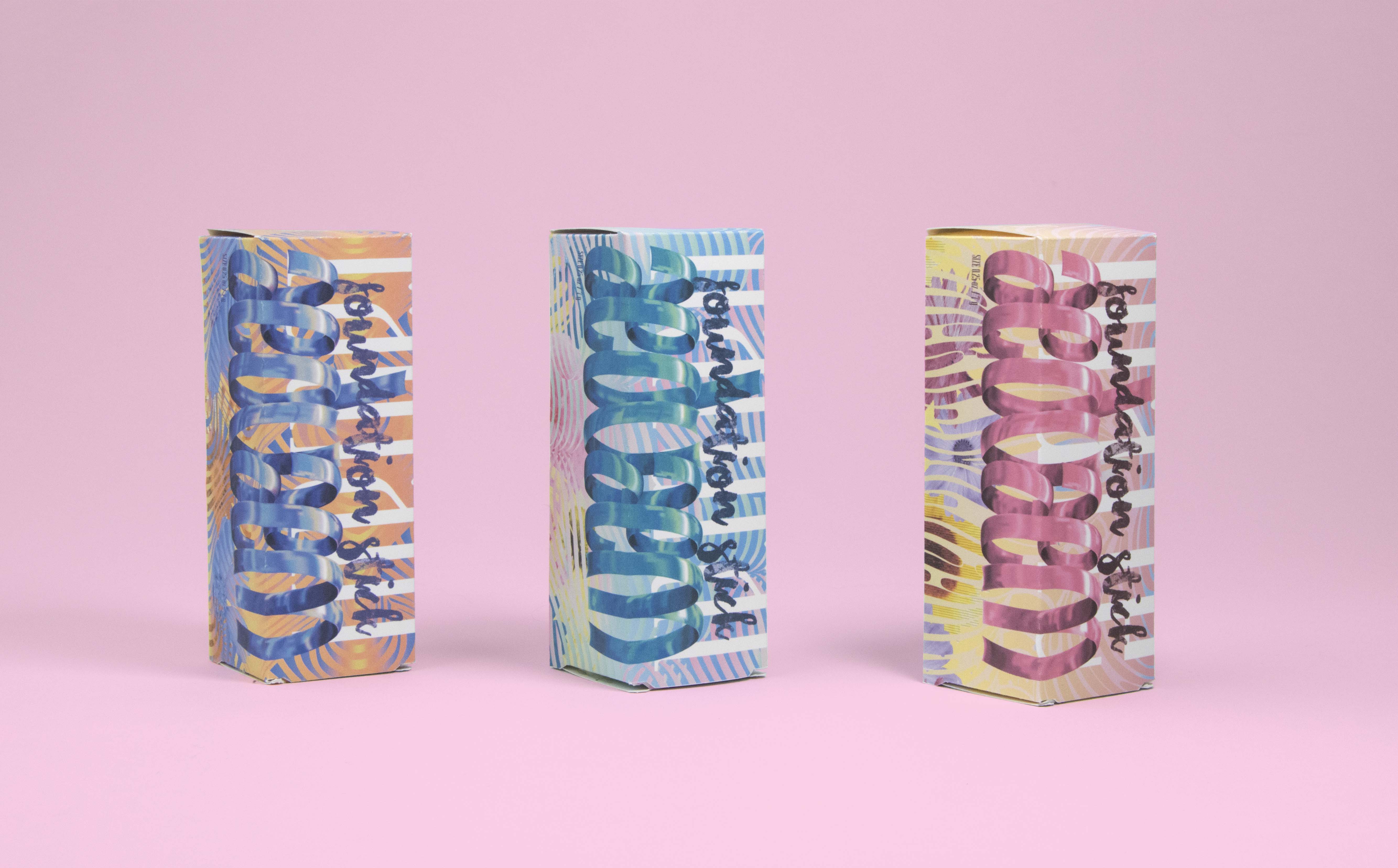 The foundation stick is packaged in an upright cuboid form with rectangular textures. It is in purple which is the least preferred color for males. The secondary packages are in pastel gradient with feminine typefaces and organic patterns, photo collages of flowers are also used.