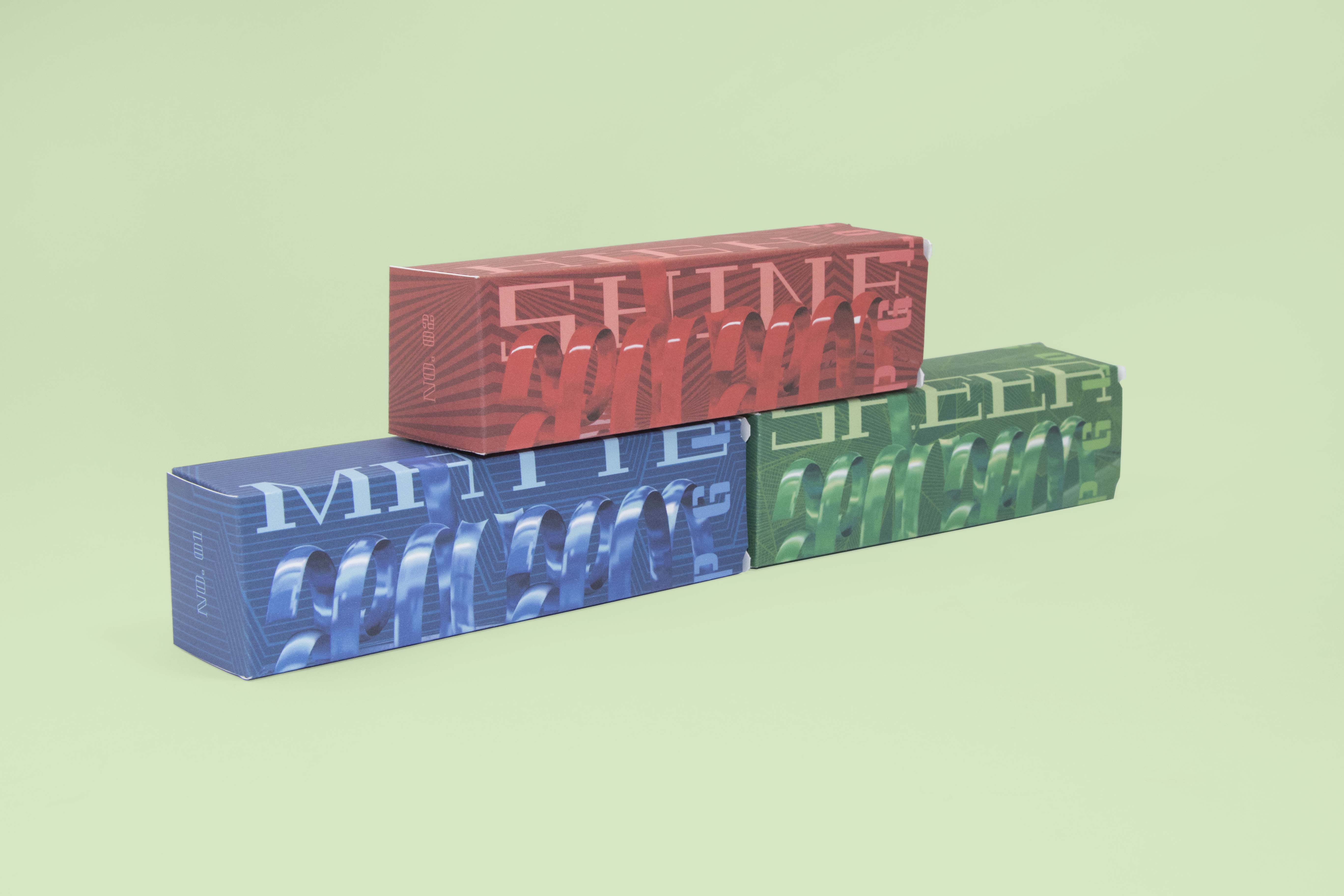 The secondary packages are designed depending on female preference. Condensed, hand script and gothic typefaces are used since they are usually associated with femininity. Cones, spheres, and organic shapes are used as patterns. Iridescent effect background and pastel color tones are also added as decorated elements.